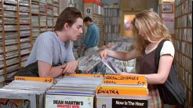 Inside the shop, the Before Sunrise scene is almost wordless - that’s what makes it so charged. Jesse and Céline drift through the aisles, pretending to browse while stealing glances they think the other won’t notice. Then they step into the listening booth, standing close but looking everywhere except at each other. It’s barely a minute of film, almost nothing happens, and yet it’s one of the most romantic moments of the whole film. The whole scene rests on hesitation, on the electricity of almost-eye contact, on the awareness that something is beginning - even if neither of them says a single thing.