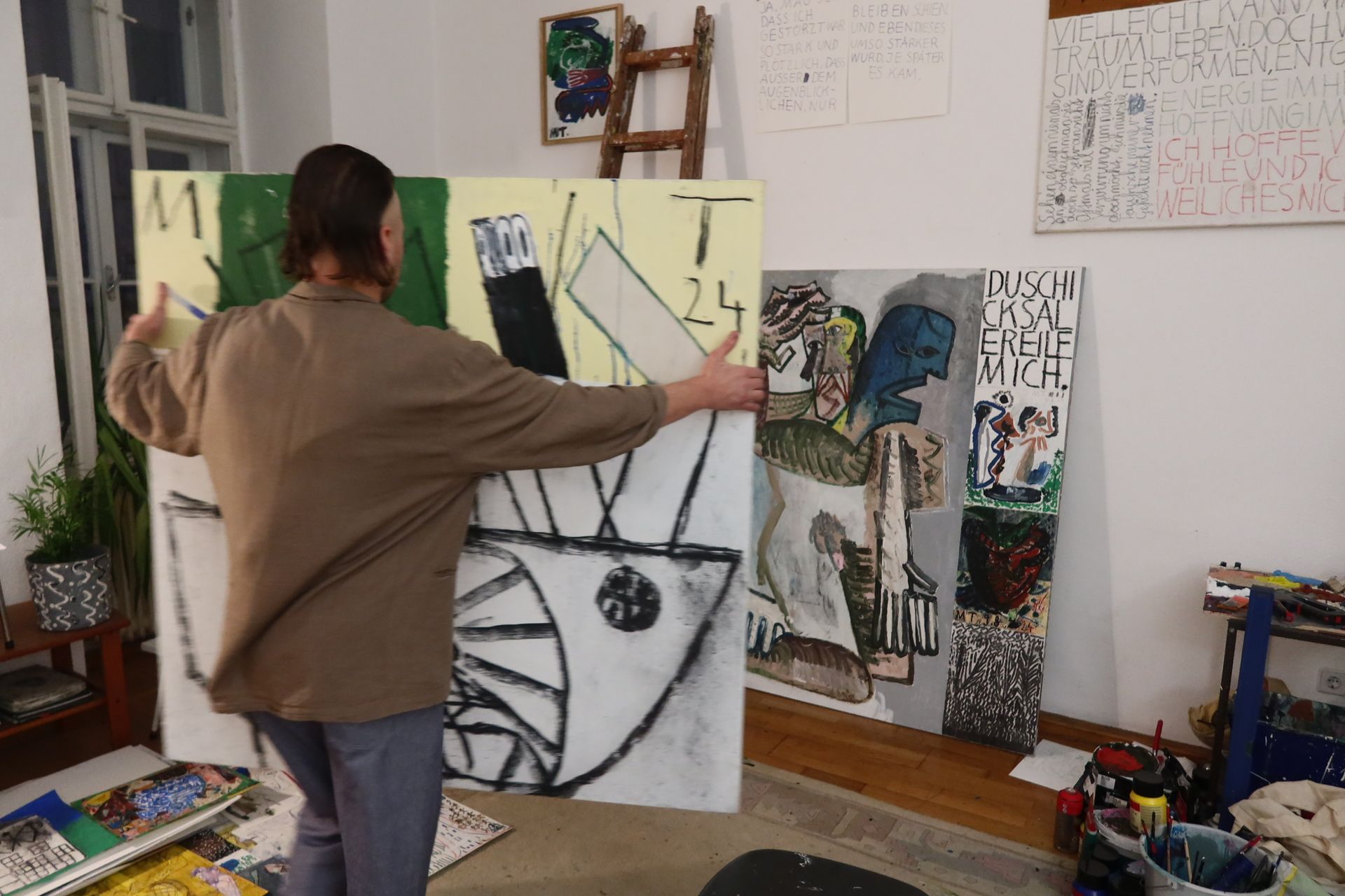 We visited Jürgen Koch in his 6th district studio this week, though our story with him technically began earlier - back at Zum Dritten Mann Wirtshaus, where he happened to be guest chef the same weekend we were hatching the Schödl × Simon Kubik wine label. Only later did we connect the dots: the chef in the kitchen was also MAFIA TABAK, the painter whose work you may have already noticed: semi-abstract, cartoon-adjacent, ironic, emotional, and always slightly off in a way that feels perfectly right.